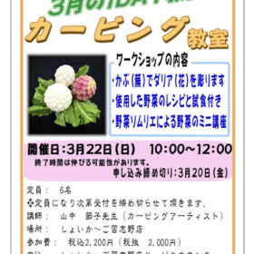 ~1day教室のお知らせ~ 3月22日(日)10:00~ しょい~ご習志野店さまにて 野菜のカービング教室を 開催します 3月はかぶで一輪のお花を作り…